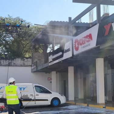 Llevamos nuestros propios tanques con agua y formula especialmente desarrollada para cada superficie y necesidad, trabajamos con baterías recargables y generador propio, no nos conectamos a sus recursos.